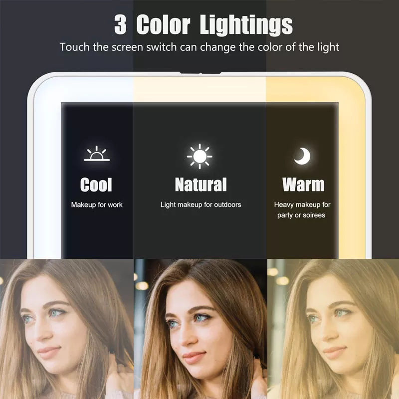 Toque el botón repetidamente para recorrer 3 modos de luz: Frío (maquillaje de trabajo), Natural (maquillaje al aire libre) y Cálido (maquillaje de noche/fiesta).
